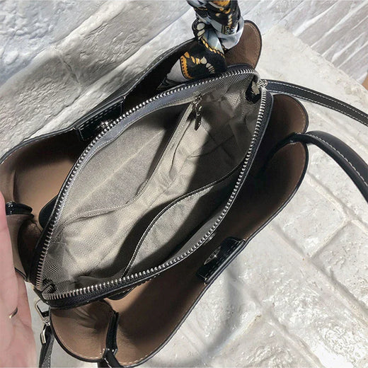 Offering unmatched versatility, this leather purse features an adjustable and removable strap that allows you to wear it comfortably across your body for a contemporary look or remove it to carry by hand using its sturdy handles for a distinguished and chic appearance. Inside, you'll find a spacious interior with two compartments, cleverly divided by a generously sized zip pocket for securing your essentials with ease. Wherever your day takes you, the Leather Bucket Crossbody Bag ensures your style remains impeccable.