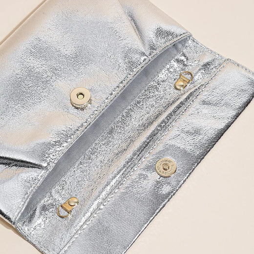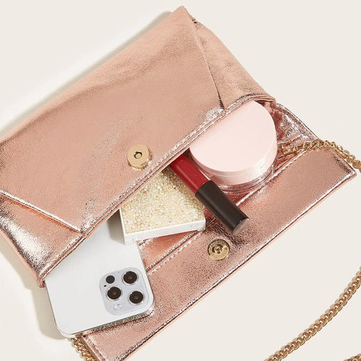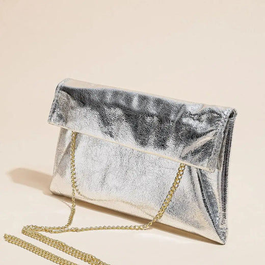 Shine brightly at any evening event with our Silver Crossbody Bag, an accessory that flawlessly combines elegance and practicality. This chic and lightweight purse is crafted from a dazzling metallic-finish material that captures and reflects light beautifully. Its versatile design allows you to either carry it in your hand for a smooth minimalist look or use the detachable golden chain for a stylish crossbody option, perfect for enjoying a night of dancing and socializing without any hassle.