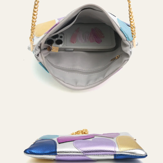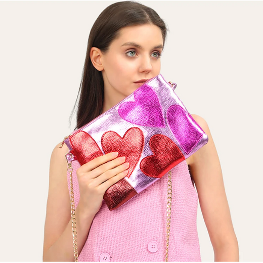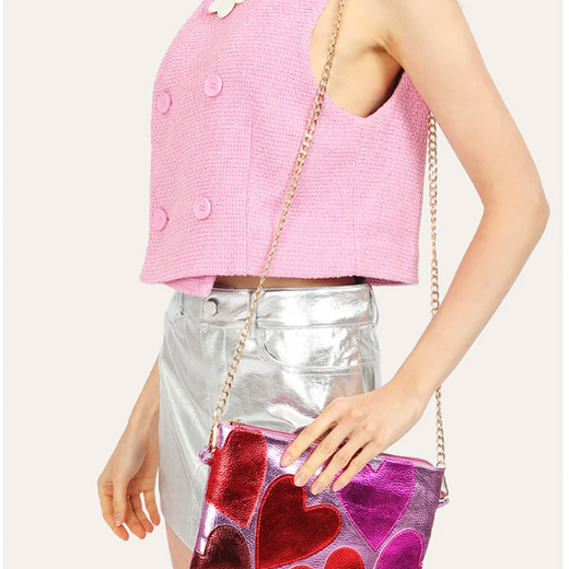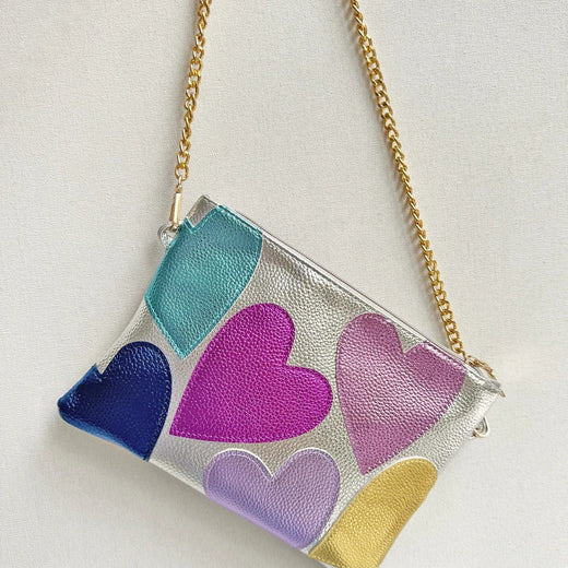 Elevate your look with our stunning Silver Leather Crossbody Bag, crafted with a metallic iridescent leather-like material for a shimmering effect. The bag features vibrant heart appliques in colors like red, pink, purple, blue, or gold, adding a playful touch to your outfit. Perfect for both casual and formal occasions, this bag is designed to catch the eye and enhance your style statement.